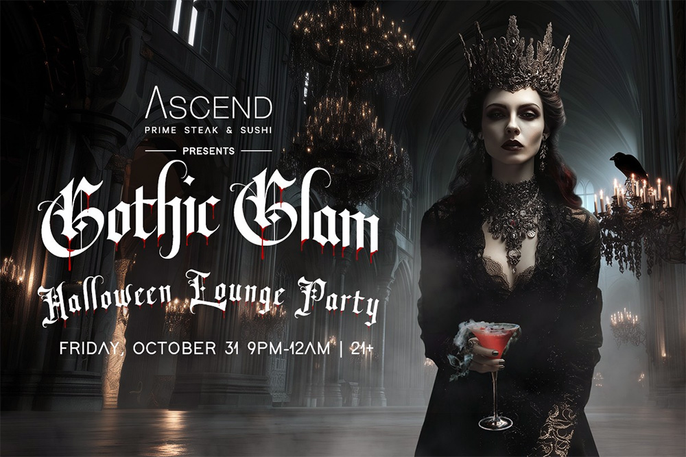 Beneath the flicker of candlelight and the shimmer of shattered mirrors, the lounge at Ascend Prime Steak & Sushi awakens for one hauntingly glamorous night on Friday, October 31st from 9pm to midnight.