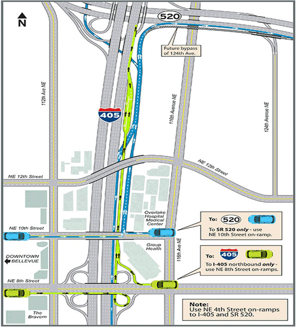 - Drivers going to I-405 will continue to use NE 8th Street but will use a new ramp to reach northbound I-405.