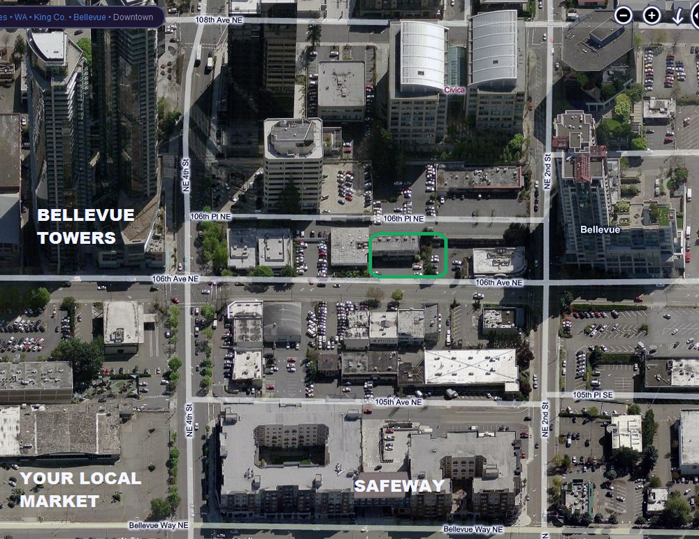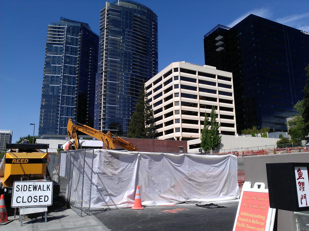 With last Friday's good weather, we hit the streets taking pictures of downtown Bellevue. On our walk we spotted a gigantic hole on the ground with heavy excavation being done on 106th Avenue NE at NE 2nd Street. What can they be building now...look at all those empty units in the distance at Bellevue Towers, we wondered.