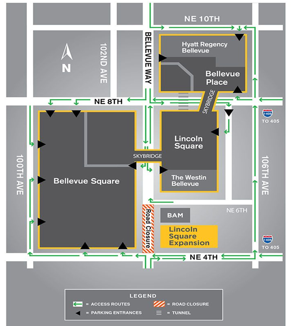 From May 12 through May 23, drivers will encounter full lane closures in both directions on Bellevue Way, from NE 6th Street to NE 4th Street. The Bellevue Square-Lincoln Square pedestrian skybridge and all adjacent businesses will remain open. Electronic message boards will be set up prior to the closure, detour routes will be provided and flaggers will be on-site to direct drivers, pedestrians and bicyclists safely around the construction zone.