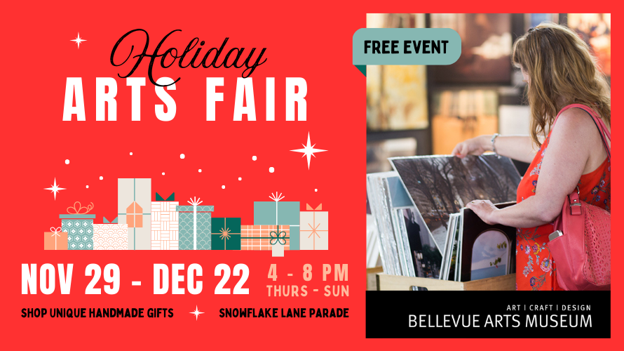 BAM Holiday Arts Fair invites the public to enjoy art and the spirit of the season in the Bellevue Arts Museum. The fair takes place during the festive Snowflake Lane parade and gives families and visitors a place to experience the power of art as well as shop for unique, creative gifts.